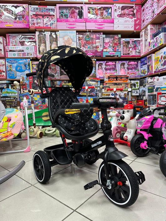 Tricycle évolutif luxe avec auvent motif plumes – Noir et or