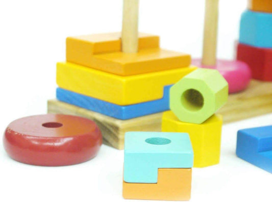 Grande pyramide d’anneaux avec trois colonnes en bois