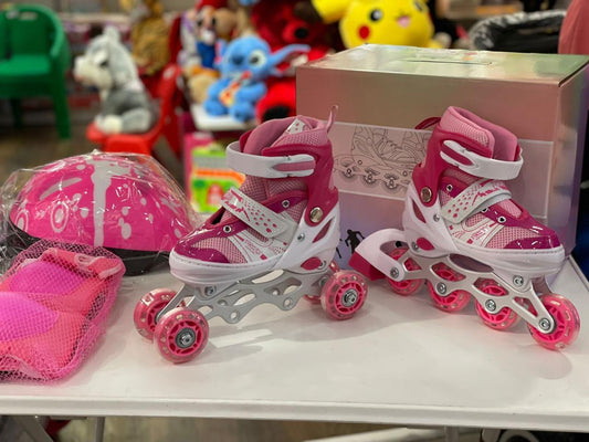 Patins à roulettes 2 en 1 – Roues interchangeables (2 ou 4 roues) – Rose – Avec casque et protections