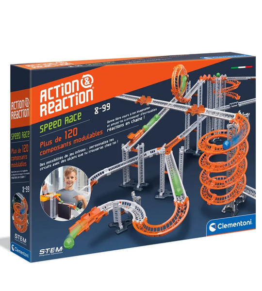 Découvrez Action & Réaction – Speed Race de Clementoni, un coffret scientifique innovant qui permet de créer une infinité de circuits à billes remplis d’effets spectaculaires. Grâce à ses pièces spéciales, les enfants peuvent laisser libre cours à leur imagination en construisant des parcours uniques et même en intégrant des objets du quotidien pour encore plus de créativité.