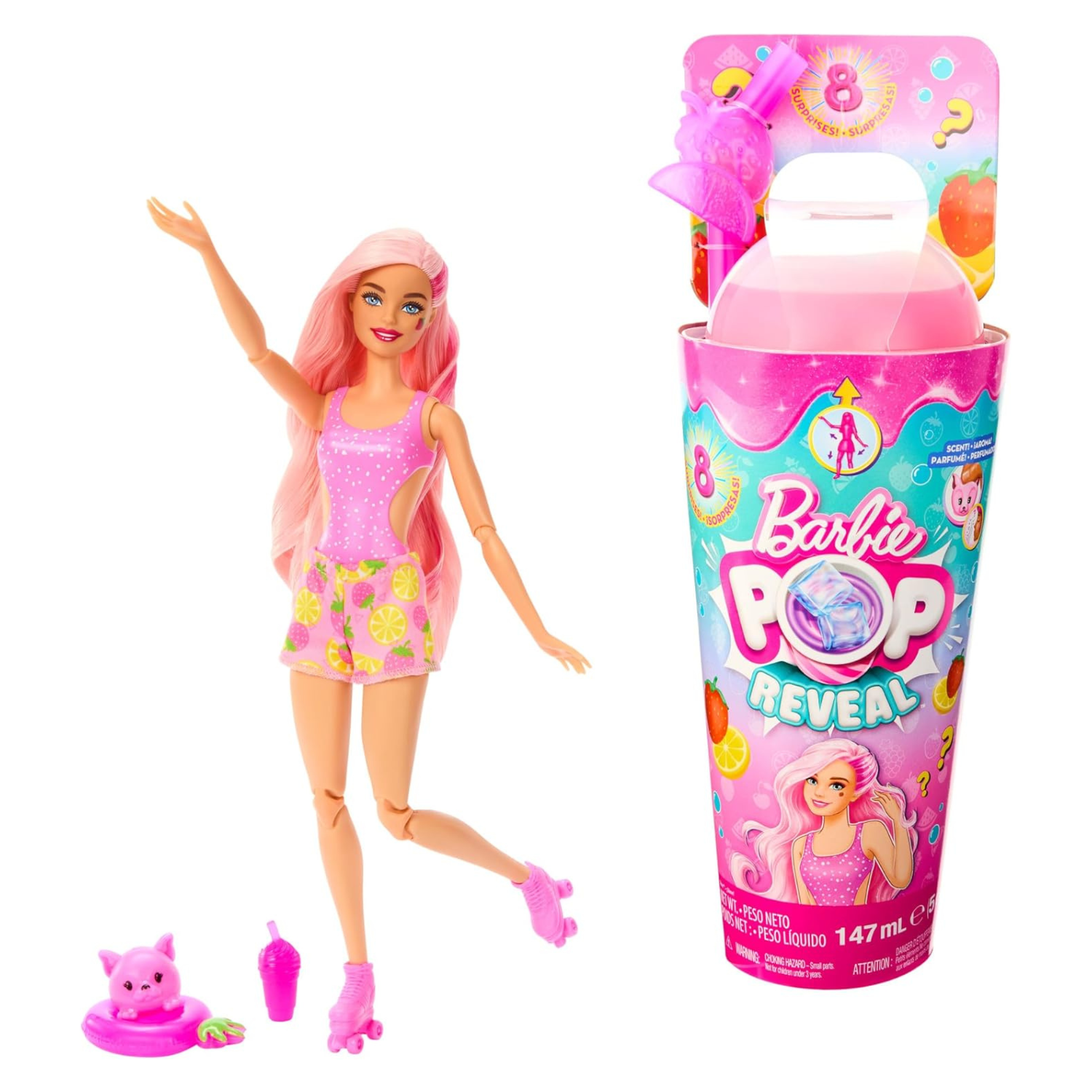 - Accessoires inclus : jupe, chaussures, patins à roulettes, mini boisson, animal parfumé