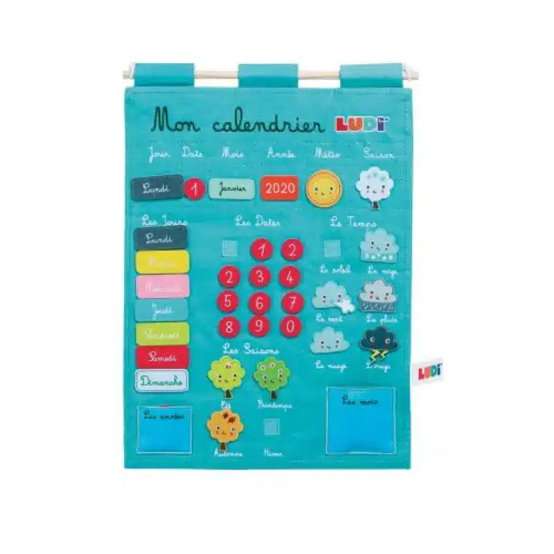 Le calendrier en tissu bleu LUDI est un outil éducatif parfait pour aider les enfants à se repérer dans le temps dès le plus jeune âge. Avec ses éléments amovibles, il permet d’apprendre les jours de la semaine, les mois, les saisons et la météo tout en s’amusant. Accompagnés par les parents, les enfants manipulent les pièces pour mieux comprendre les notions temporelles et développer leur curiosité et autonomie.