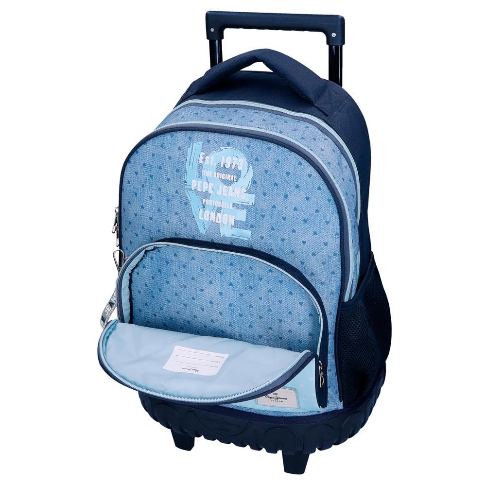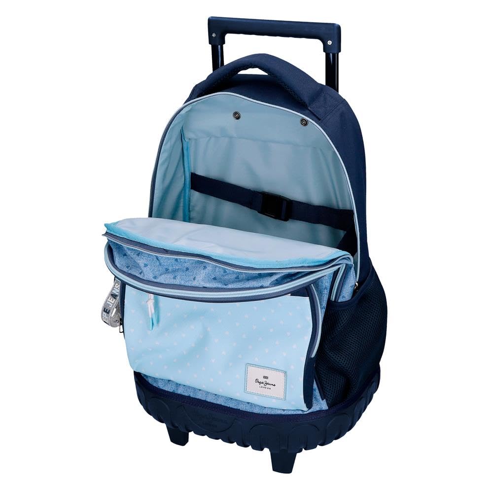 Un cartable trolley pratique et raffiné signé Pepe Jeans. Avec son design bleu inspiré de Portobello London, il associe style urbain et fonctionnalité. Son système à roulettes solides et sa poignée télescopique assurent un transport confortable au quotidien.