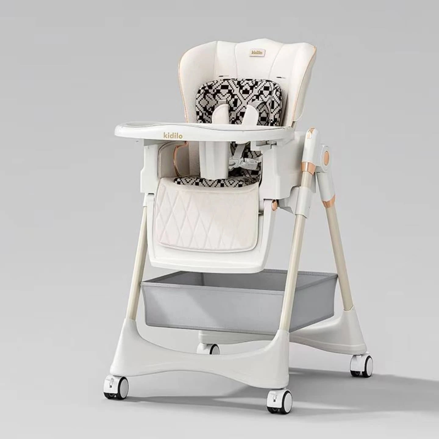 Chaise haute multifonction qui offre à bébé un espace de repas confortable et sûr. Elle se plie en quelques secondes, se déplace facilement grâce aux roulettes et s’adapte à chaque moment de la journée : repas, jeu ou repos.