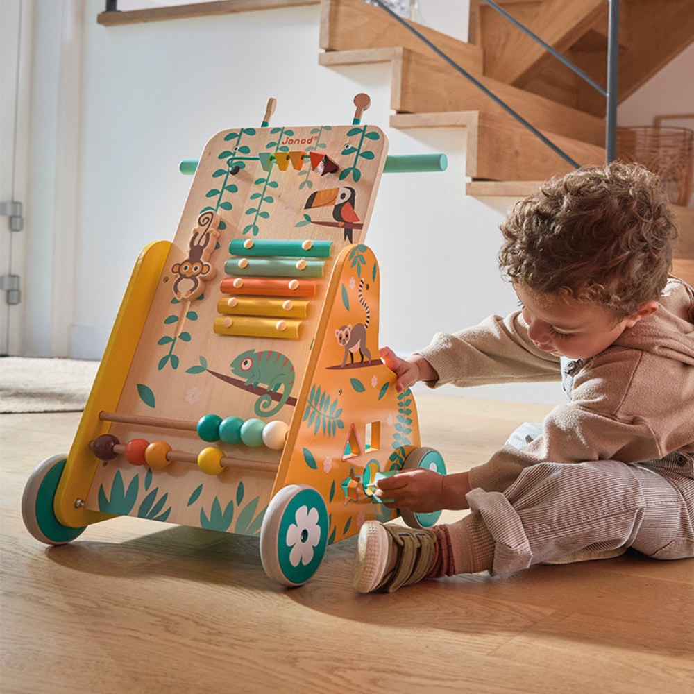 Chariot de marche en bois coloré avec 6 activités intégrées