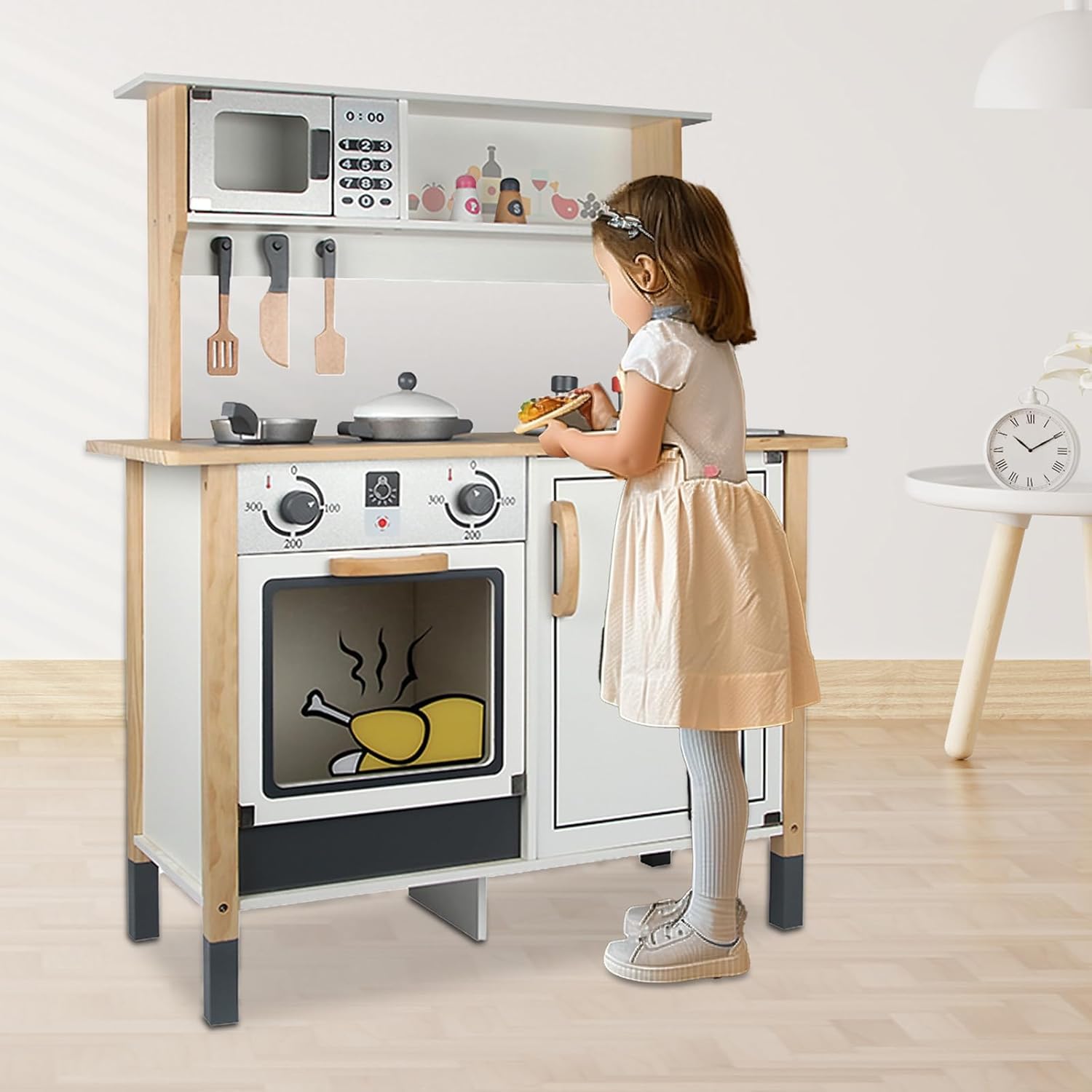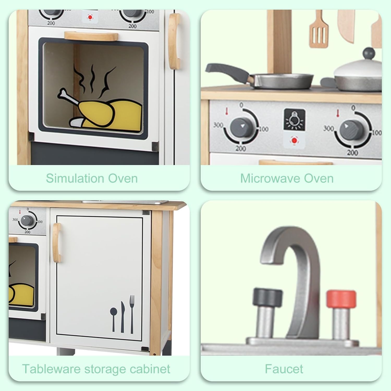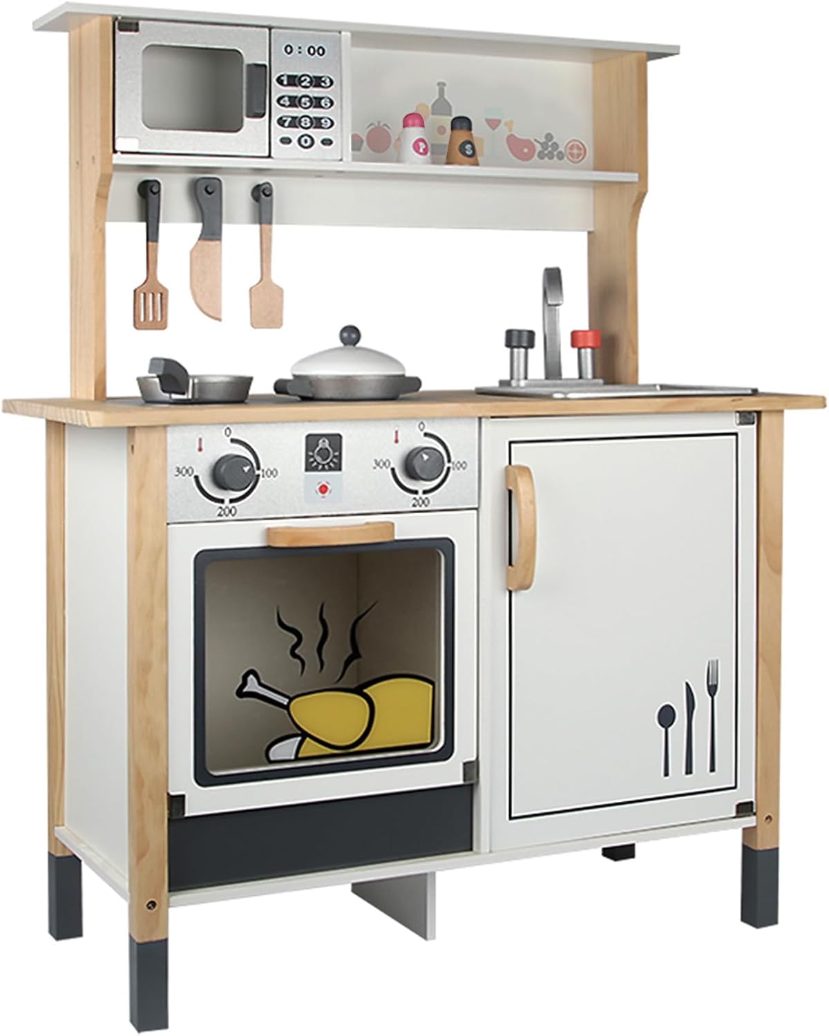 Accessoires inclus : deux plaques de cuisson avec boutons rotatifs, four à ouverture facile, robinet analogique, casseroles, bouteilles d’épices, spatule et couteau en bois