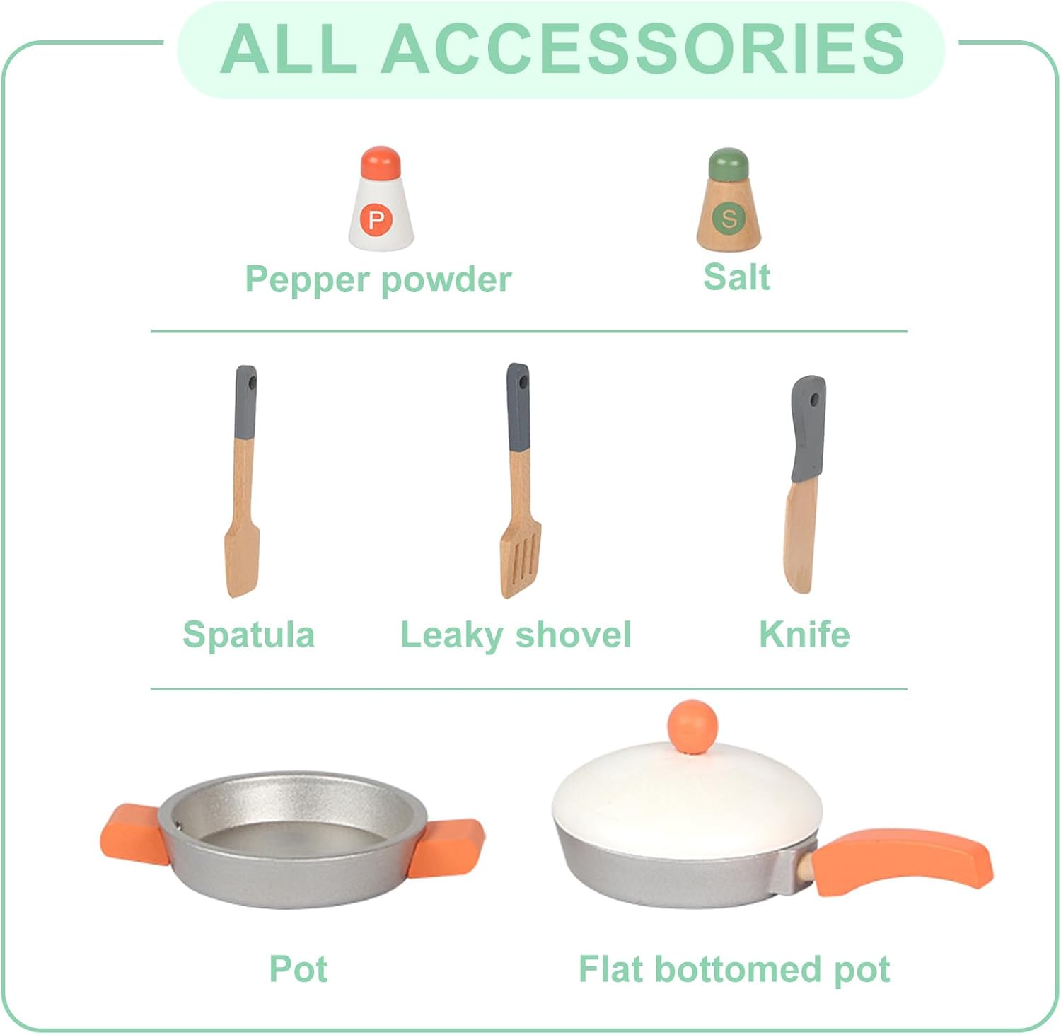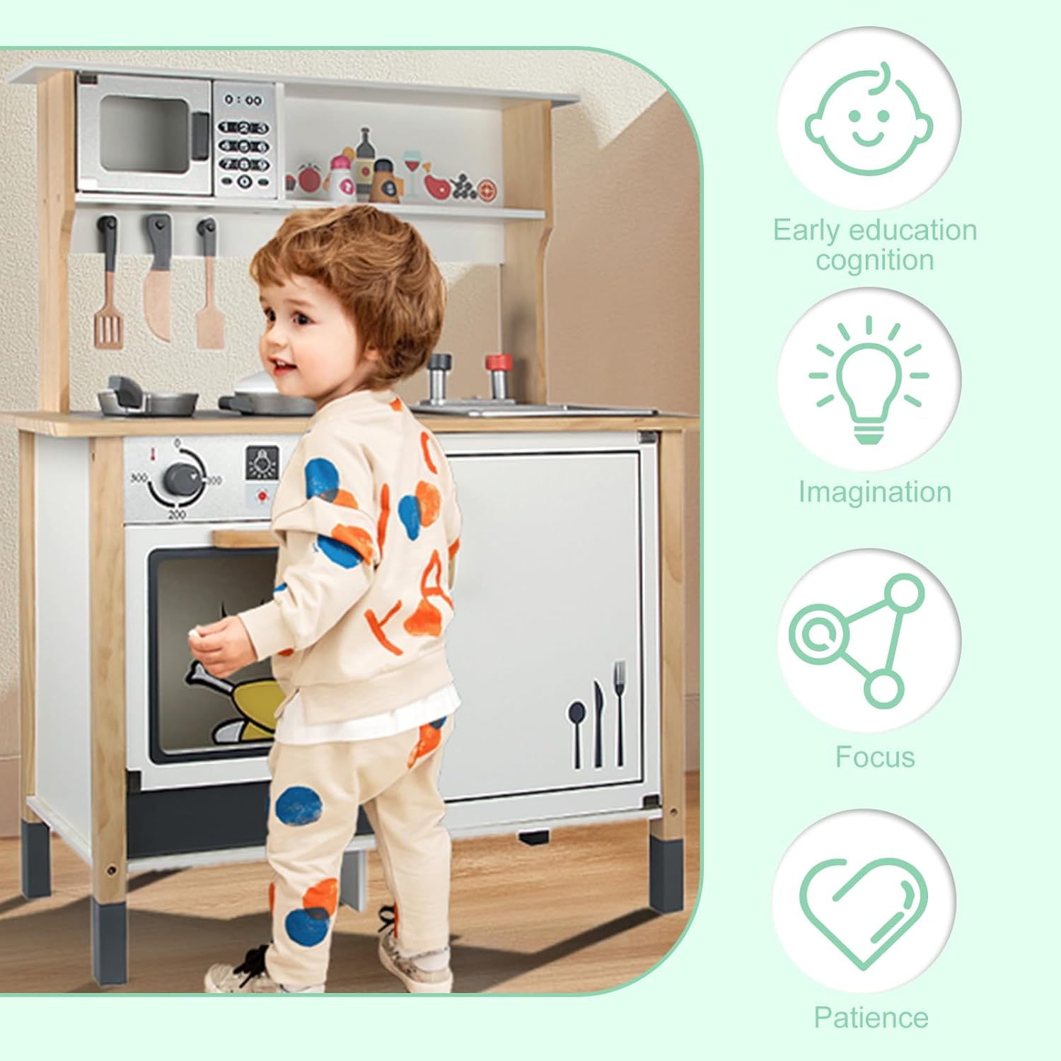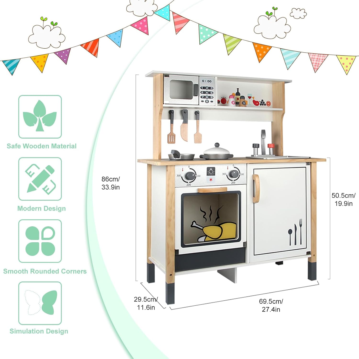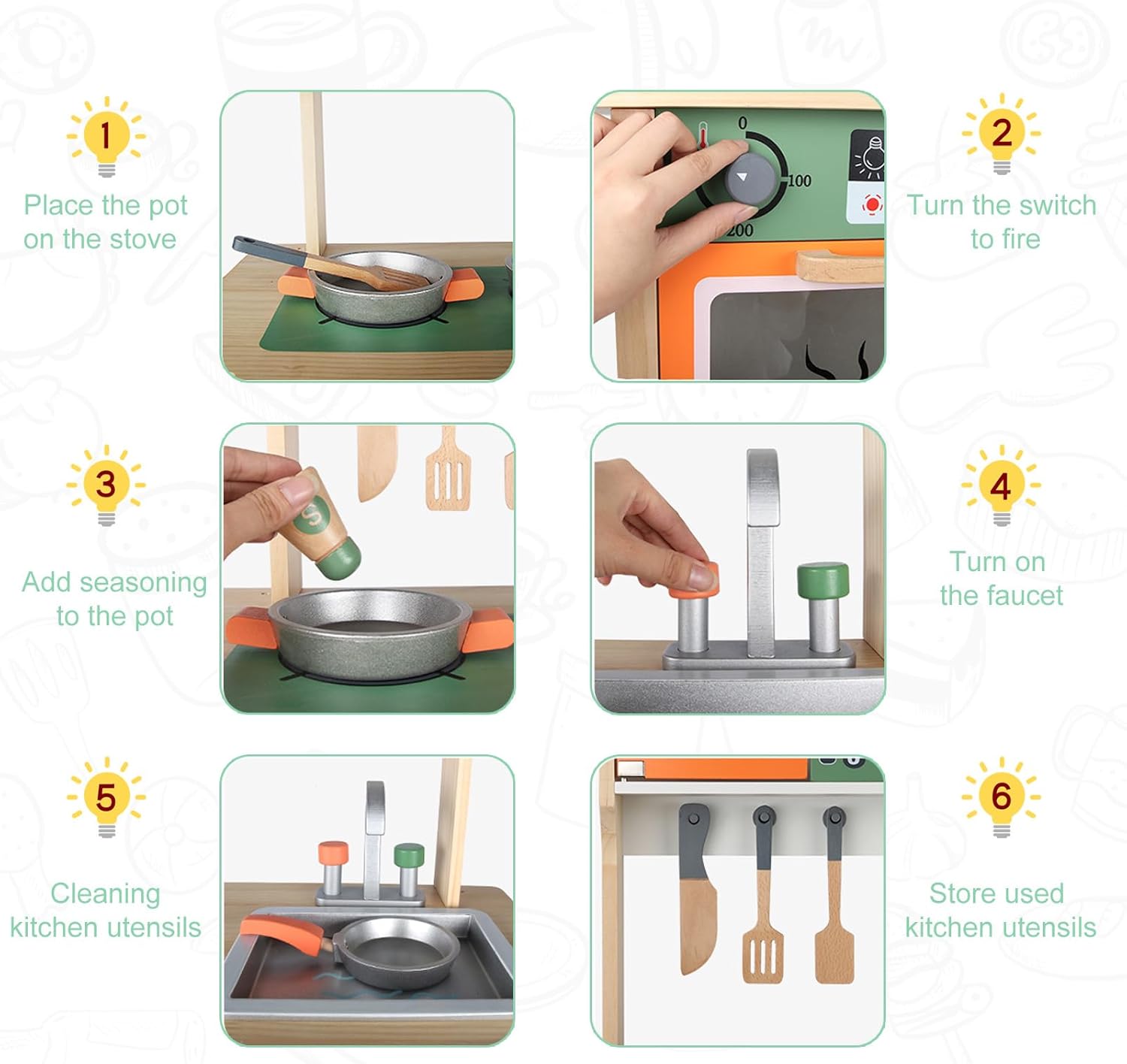 Accessoires inclus : deux plaques de cuisson avec boutons rotatifs, four à ouverture facile, robinet analogique, casseroles, bouteilles d’épices, spatule et couteau en bois