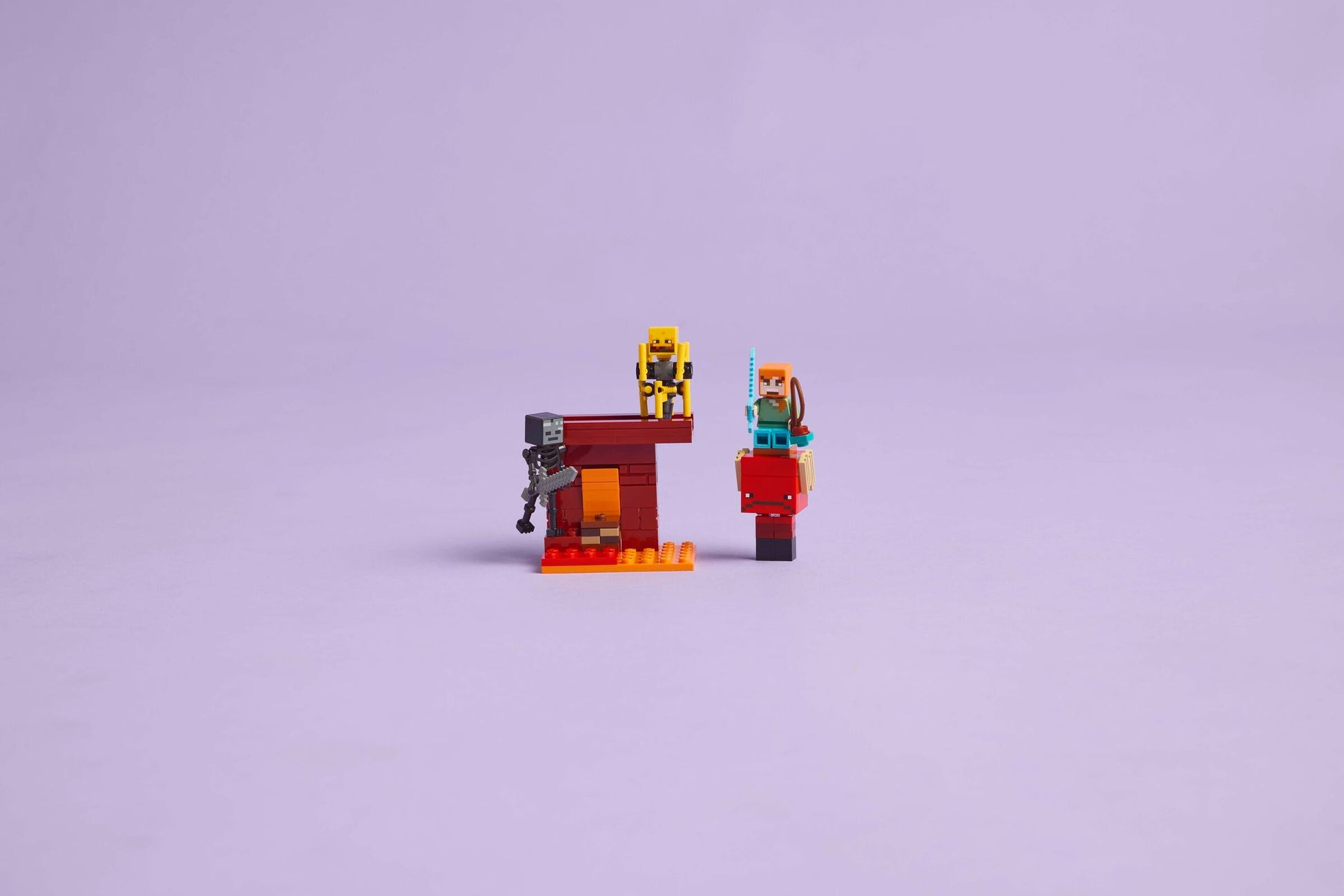 Le set inclut une section à construire du pont de la forteresse du Nether dans la Forêt carmin, ainsi que les figurines LEGO® Minecraft d’Alex, d’un Wither squelette, d’un Blaze et d’un Arpenteur. Les enfants peuvent combattre les créatures avec l’épée en diamant, échapper à des chutes de lave et chevaucher l’Arpenteur avec ses pattes mobiles et sa selle. L’appli LEGO Builder permet de visualiser le modèle en 3D, zoomer et faire pivoter le modèle pour suivre la construction étape par étape.