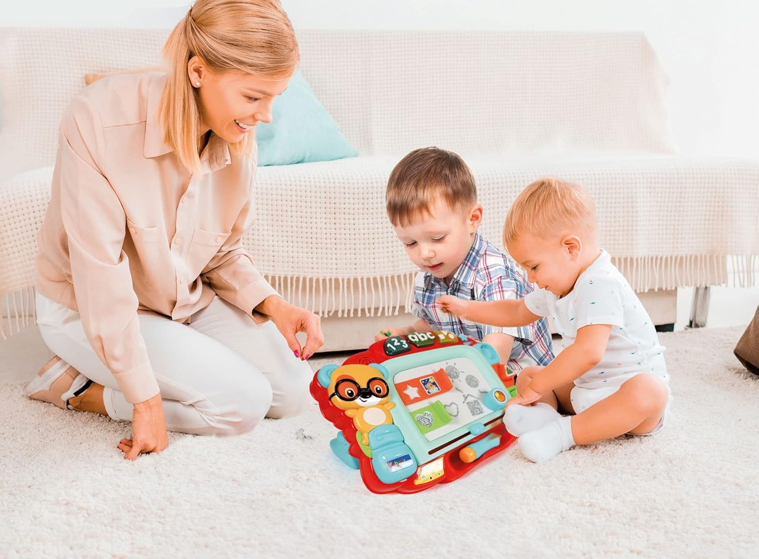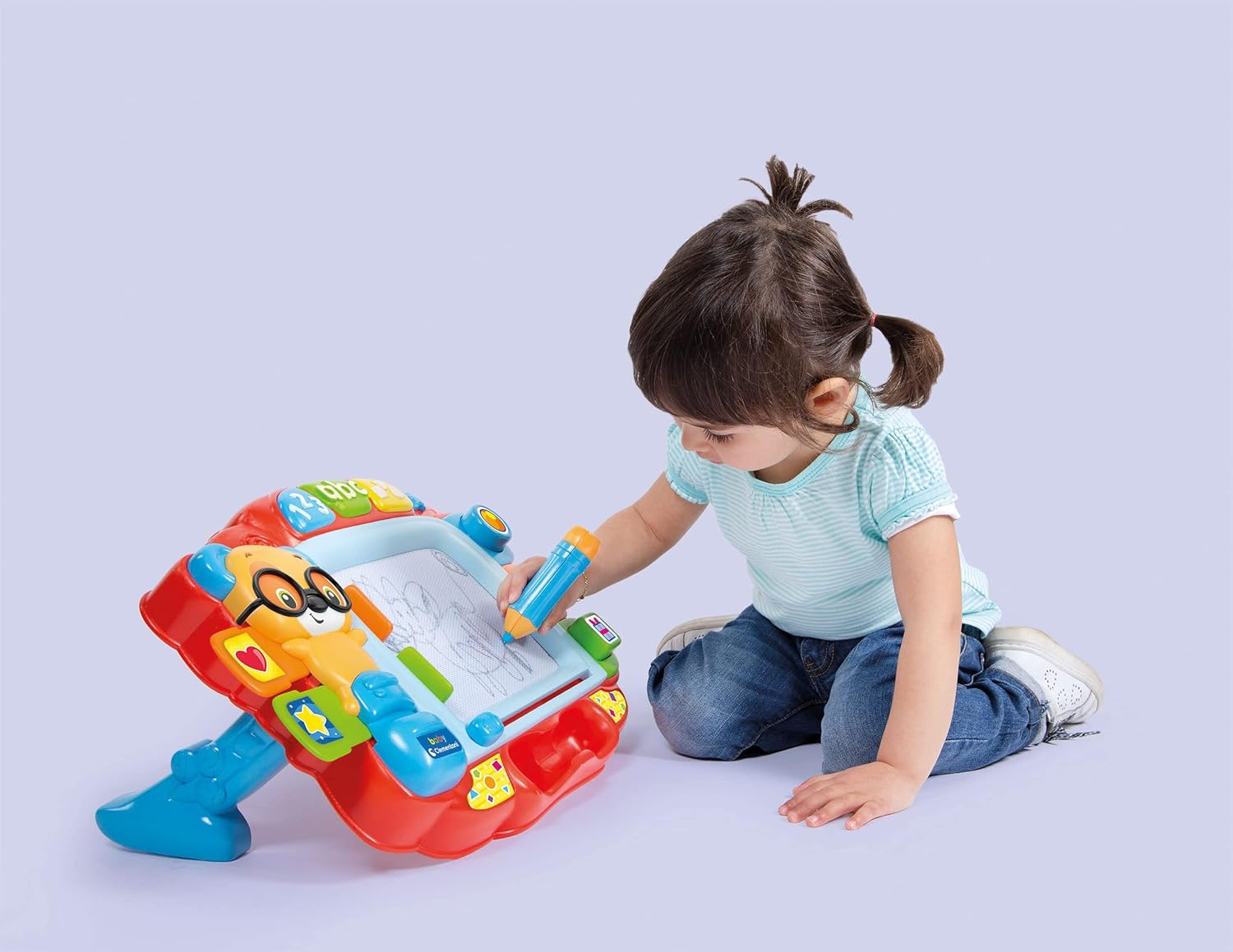 Le Tableau de bébé est un centre d’activités complet et coloré qui aide les tout-petits à développer leur créativité et leur motricité tout en s’amusant. Il combine dessin, musique, sons et lumières pour offrir une expérience interactive et ludique dès 18 mois. Grâce à ses règles amovibles, pochoirs et formes magnétiques, les enfants peuvent apprendre à tracer et dessiner facilement, tout en découvrant des mélodies, des bruits d’animaux et des effets lumineux.