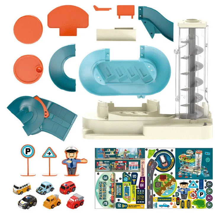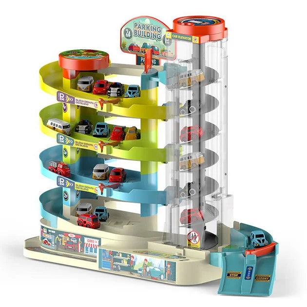 Le “Challenge Parking Game” de HUANUO est un parking géant à 5 niveaux qui stimule l’imagination et la motricité. Les enfants montent les voitures avec l’ascenseur à vis transparent, puis dévalent les rampes en spirale jusqu’aux 24 places de stationnement. Le set comprend 6 véhicules, des panneaux de signalisation et une figurine pour inventer d’innombrables scénarios urbains. Idéal pour le jeu libre, le tri, l’apprentissage des règles de circulation et la coordination œil‑main.
