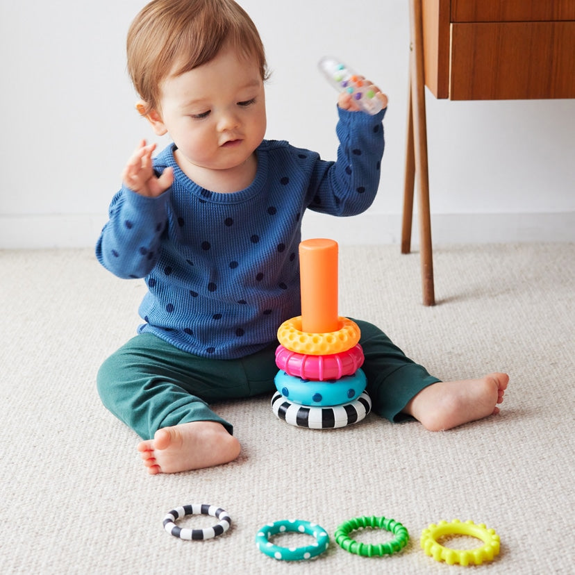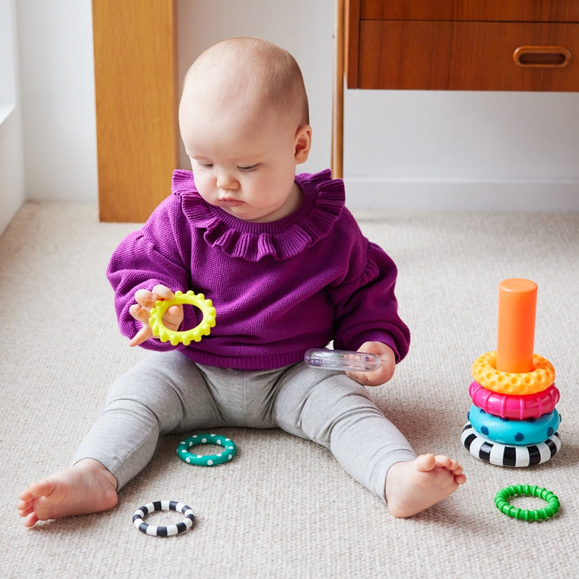 Composée de 8 anneaux colorés et texturés, elle invite bébé à empiler, trier, secouer et découvrir tout en développant sa coordination œil-main.