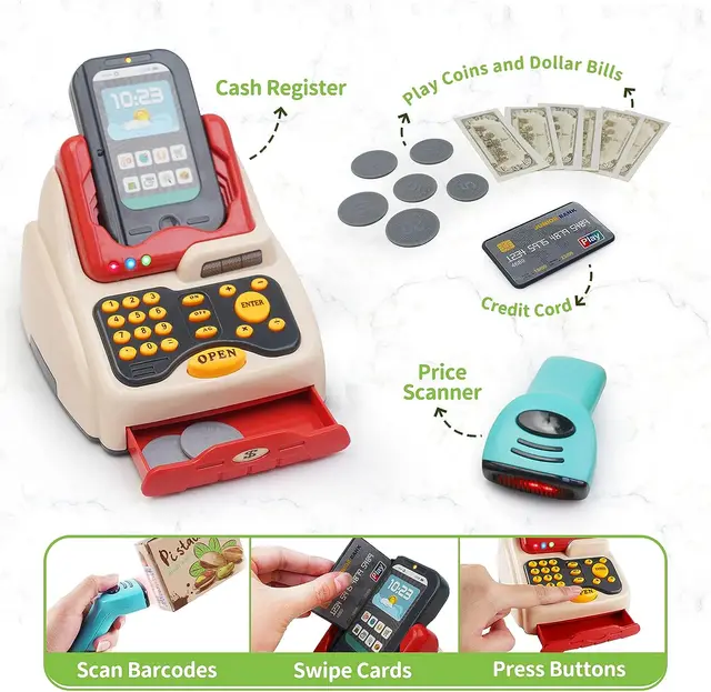 Offrez à votre enfant une véritable expérience de shopping à la maison ! Ce supermarché interactif comprend une caisse enregistreuse réaliste avec sons et lumières, un scanner, une carte bancaire, de la monnaie factice et un chariot rempli de produits. Idéal pour stimuler l’imagination et le jeu de rôle.
