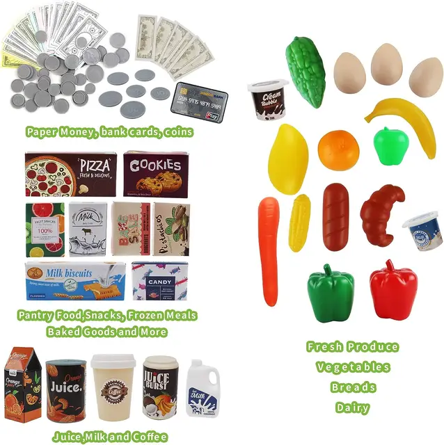 - Ensemble complet de 48 pièces : fruits, légumes, produits, caisse, scanner, cartes, billets…