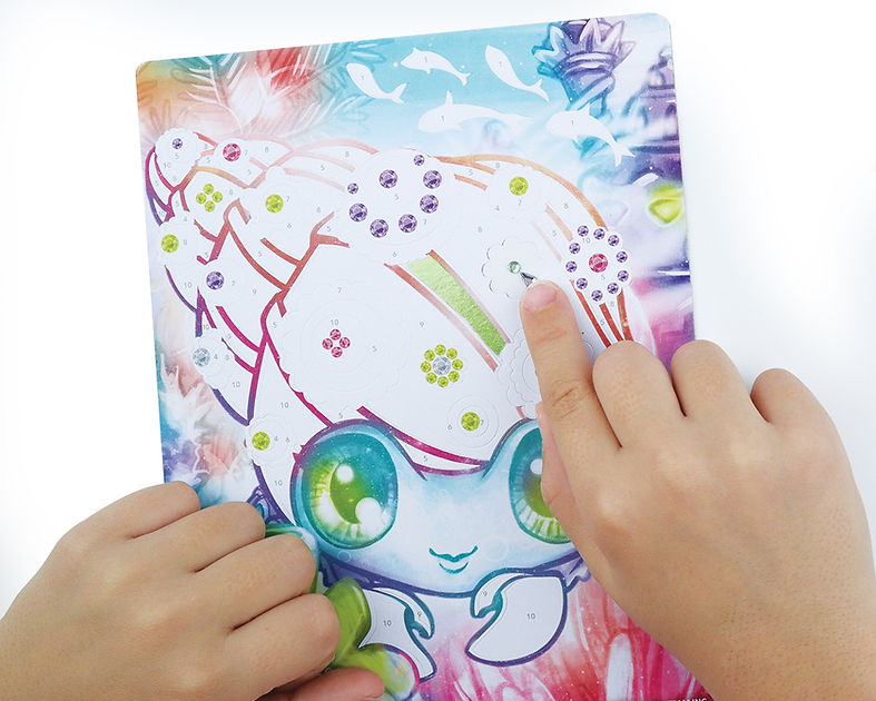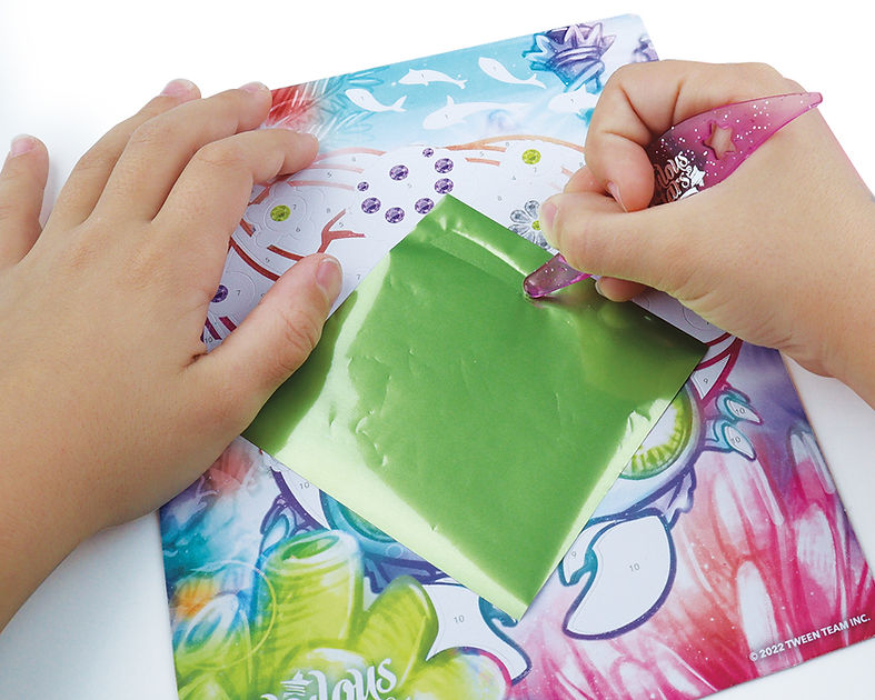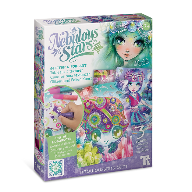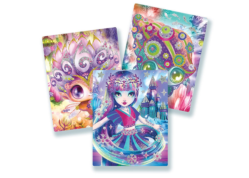 Inclus : 3 tableaux imprimés, 6 feuilles métalliques, 4 tubes de poudre scintillante, strass, outil de transfert, pinceau, l’histoire complète de Marinia, instructions en couleurs